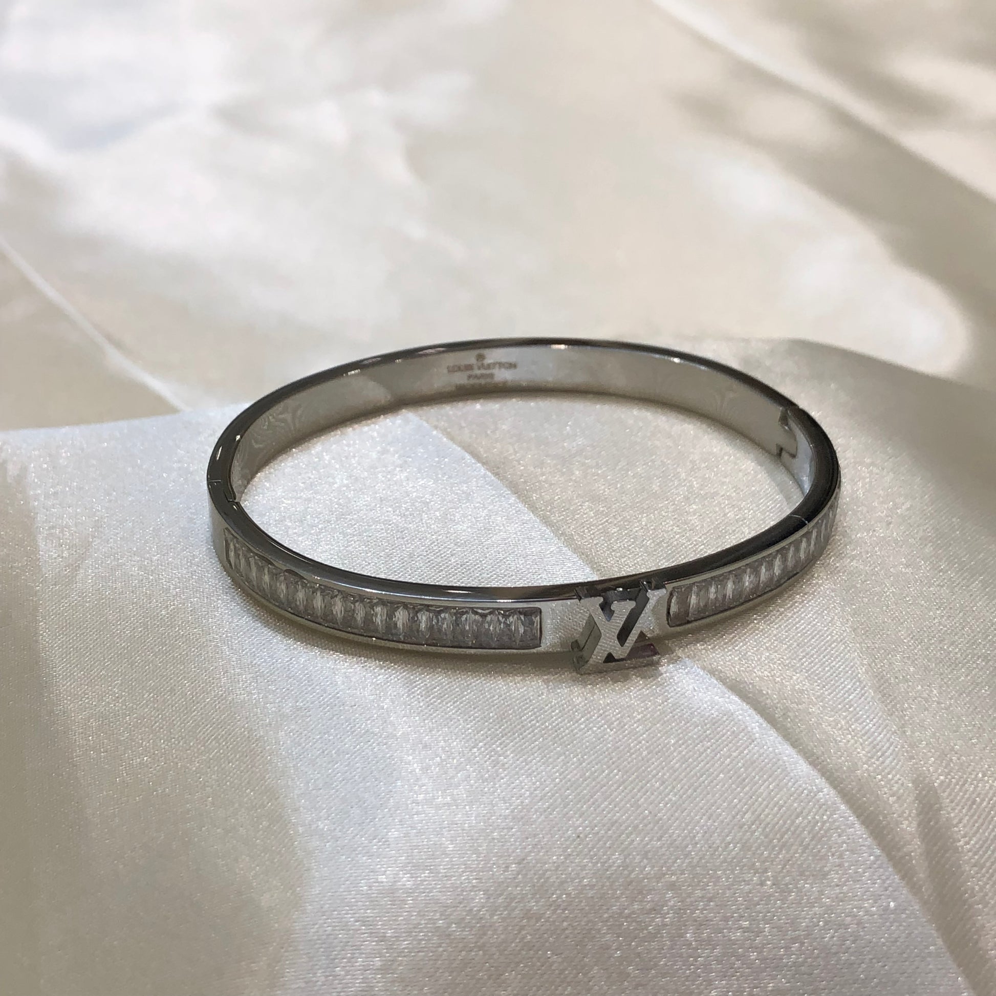 The Louis Vuitton Mini LV Logo Bracelet in Pakistan showcases expert craftsmanship paired with a minimalist aesthetic. Crafted from premium silver, its slender design provides a contemporary and sophisticated accessory. Perfect for those who value understated elegance and adaptable style suitable for any occasion.
